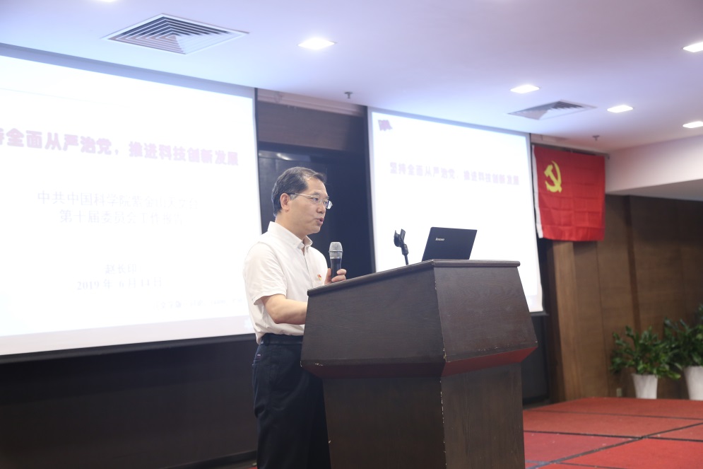 2019年6月14日上午,紫金山天文台召开党员大会,选举中共中国科学院紫金山天文台第十一届委员会和第九届纪律检查委员会。南京分院分党组副书记、纪检组组长李洪伟应邀出席大会,野外台站支部书记、站长和民主党派代表应邀列席了大会。会议由党委委员、党办副主任陈红玲主持。