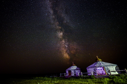 照片为在草原上拍摄到的人马座方向银河。由于银心的存在,该部分银河为目视银河中最为壮观的一段,内有大量的星云,比如著名的礁湖星云,三叶星云等。从照片中可以看到由于大量尘埃的遮挡,使得银河在此处分叉,中间的暗带正是银道尘埃。银河下的蒙古包构成了一副人与自然的和谐画面。
