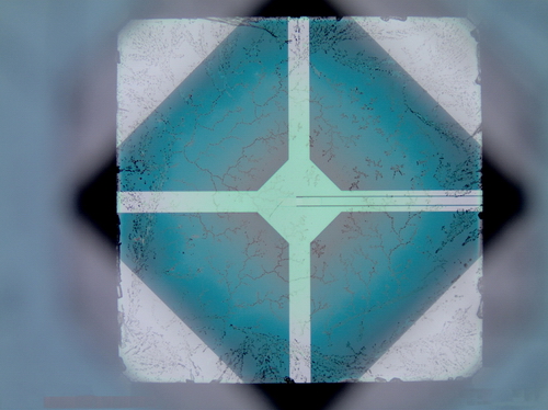 图片描述:本作品是太赫兹超导相变边缘探测器芯片的核心区域显微照片。该区域呈现出多层次的正方形交错重叠景象,中间部分自然形成机理纹路,类似中国传统的窗花图案。该探测器芯片工作在几百mK的温度下,具有极高的探测灵敏度,是探测微弱太赫兹信号的有力工具,在太赫兹天文观测中具有重要作用。