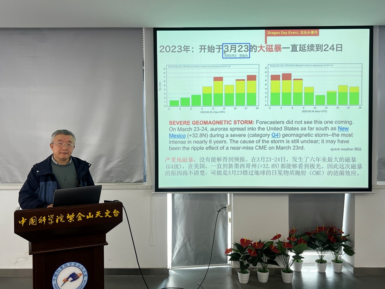 季海生研究员是太阳活动研究领域的资深专家,多年来扎根一线,利用地面与空间观测数据,在太阳物理领域取得了一系列具有国际影响力的成果。虽已退休,他仍坚守在科研一线,身体力行传承科学家精神,悉心培养年轻人,让踏实进取、锲而不舍的作风薪火相传。活动中,他作了“我所参与的太阳研究”专题报告。季海生研究员以自己从研究生成长为研究员的学术轨迹为脉络,生动讲述了他在科研道路上的几次重要突破。活动当天恰逢农历二月初二“龙抬头”,他特别介绍了团队关于一种新型太阳爆发所导致的“龙抬头事件”(磁暴)的研究工作。他从早期模仿学习起步谈起,到如何在坚持中攻克难题、在执行中落实研究设想,娓娓道来,让在场人员深刻感受到科学家的执着与专注。
