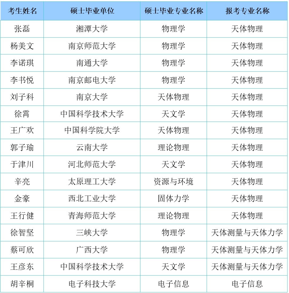 根据中国科学技术大学 2026 年博士研究生 “申请考核制” 招生指导意见,以及中国科学技术大学天文与空间科学学院(紫金山天文台)2026 年公开招收攻读博士学位研究生报名公告相关要求,经专家组对考生资格进行审核,以下考生通过天文与空间科学学院初审,进入综合考核环节。现将名单予以公示,公示期:2026年3月30日--4月3日。如对公示考生的报考资格有异议,请以真实姓名向研究生部反映。联系电话:025 83332122(缪老师);025-83332257(纪检)。