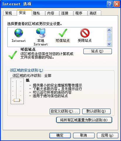 4、 单击“默认级别”设置“受信任站点的安全级别”——默认安全级别为—低。