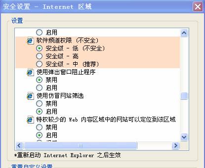 除“使用弹出窗口阻止程序”设置为“禁用”外,请将其它所有的选项均设为“启动”,单击“确定”退出。