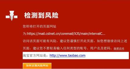 2013年12月30日,部分用户反映,当在Internet Explorer 浏览器中登录http://mail.cstnet.cn网站,进入邮箱时,浏览器会出现“检测到风险”的提示,如图所示