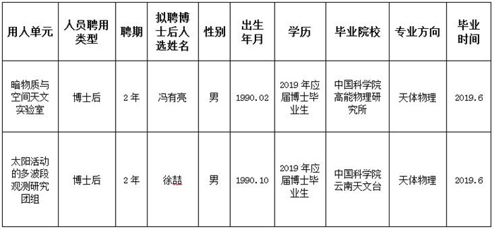 关于2019年中国科学院紫金山天文台拟聘博士后人选的公示