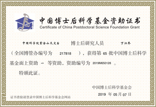 根据中国博士后基金会通知,中国博士后科学基金第65批面上资助评审结果已揭晓,紫金山天文台博士后丁江乔荣获中国博士后科学基金第65批面上资助一等资助,是该项基金全国天文学领域唯一获得者。