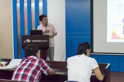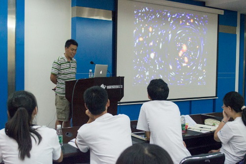 7月15日上午,夏令营开营,首先,紫台副台长常进致开幕词,也为期一天的学术报告活动拉开序幕。常进研究员从时间、空间、天文望远镜的发展史,结合紫台现阶段各研究团队研究方向,言简意赅讲述了天文学研究的对象、方法和现代天文前沿科学技术领域。幽默诙谐的言语让营员们深感天文学的魅力。史生才研究员作《太赫兹超导探测器技术》报告,介绍射电望远镜系统的组成,ALMA,SKA以及南极天文相关内容,范一中研究员、刘四明研究员、纪丽研究员分别作《暗物质粒子探测卫星项目及紫台的科学组》、《宇宙中的高能粒子》、《宇宙伽玛射线暴》、《Spectroscopy in High Energy Astrophysics》一系列学术报告,下午,营员们聆听了一场别开生面的关于人生哲学的报告——中国科学院大学马石庄副校长的《感性的人与能动的实践》,老师从“人为什么活着”到“对人生的看法”,并引用西南联大的精神告诫营员们:“身处逆境,而正义必胜的永不动摇信念,以及对国家民族的前途所具有的高度责任感,曾启发和支撑了西南联大师生对敬业、求知的追求”。随后,季江徽研究员、陈学鹏研究员、汪宏波博士分别作《行星科学:一个充满活力的前沿科学领域》、《分子云与恒星形成》、《人造天体动力学与探测》等学术报告。营员们深深体会着研究员们的精彩报告,并与他们沟通交流,研究员老师们深入浅出的回答激发了营员们对科研的兴趣,这为他们以后更深入的学习奠定了一定的基础。