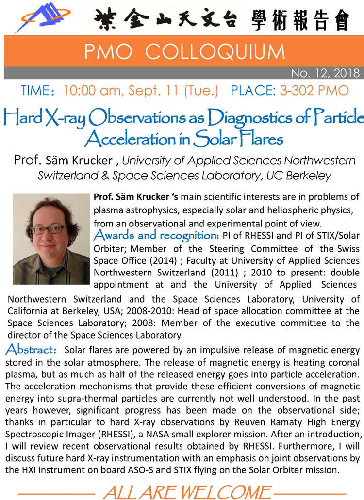 9月11日 PMO Colloquium:Hard X-ray Observations as Diagnostics of Particle Acceleration in Solar Flares