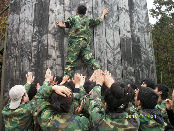 在十月军校教官的带领下,同学们共同参与了“蟹王争霸赛”、攀岩、信任背摔、生死电网、盲人迷宫、翻越毕业墙等项目,完成了很多不可能单凭个人就能完成的任务,团队合作精神得到极大的体现。尤其是在最后的毕业四米墙项目中,大家通力合作,坚持不懈,终于在规定时间内全部翻越四米墙,紫台研究生拓展活动圆满成功。