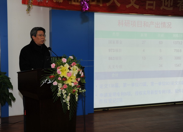 大厅内张灯结彩、欢声笑语、座无虚席,一派喜庆景象。常务副台长杨戟首先向全台职工致新年贺词,并通报了紫台2010年工作总体情况和“十二五”战略规划方案。他说,在全台职工的共同努力下,紫台2010年度各项事业继续发展。科研事业方面:2010年,紫台承担的国家基金项目、973项目、863项目和天文专项在研128项,新增44项。共发表论文138篇,其中第一单位73篇,第一单位SCI论文53篇。申请发明专利8项,授权实用新型专利1项,软件著作权登记2项。其中:嫦娥二号伽玛谱仪成功运行,暗物质与空间天文实验室批准成为科学院重点实验室,姚安站建设和观测设备调试进展顺利,超导成像频谱仪安装运行,南极天文台建设取得重大进展。园区建设方面:紫金山环境改造I期工程完工,完成了紫金山环境改造总体规划;仙林新园区筹备进展顺利。最后,杨戟祝全台离退休职工、在职职工、全体研究生:新年快乐、身体健康、阖家幸福!