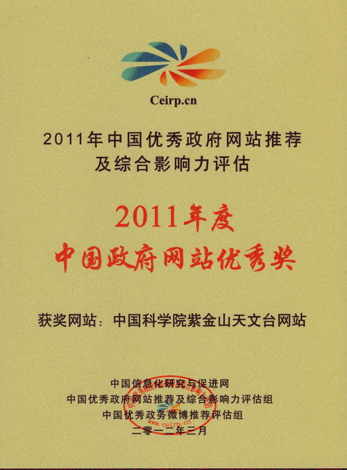 据中科院网站报道(http://www.cas.cn/xw/yxdt/201112/t20111226_3417373.shtml):2011年12月25日,2011年度中国政府网站推荐及综合影响力评估结果正式公布,中科院紫金山天文台网站荣获2011年度“中国政府网站优秀奖”,此外,中科院网站荣获“政府网站优秀奖”和“快速发展型政府网站奖”,中科院心理研究所和大连化学物理研究所也获得“政府网站优秀奖”。
