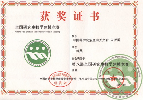 2011年9月25日至28日,紫金山天文台研究生侯永刚、林厚源、朱听雷参加全国研究生数学建模竞赛,并最终在12 月的评奖中获得全国三等奖。