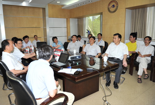 白春礼一行听取了紫台常进研究员关于暗物质粒子探测卫星项目的进展汇报,参观了暗物质粒子探测器样机研制实验室。