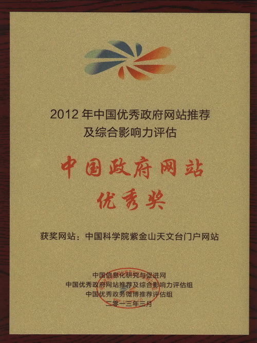 12月25日,2012年中国优秀政府网站推荐及综合影响力评估结果正式公布。中科院紫金山天文台中文网站荣获“中国政府网站优秀奖”。这是继2011年之后紫金山天文台第二次获得此奖项。中国科学院、中科院心理研究所、中科院大连化学物理研究所均获此殊荣。
