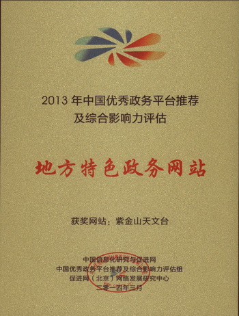 2013年12月26日,2013年中国优秀政务平台推荐及综合影响力评估结果正式公布,紫台门户网站荣获2013年度中国创新型政务平台地方特色政务网站奖。2013年度中科院系统还有院网站和大连化学物理研究所网站获奖。