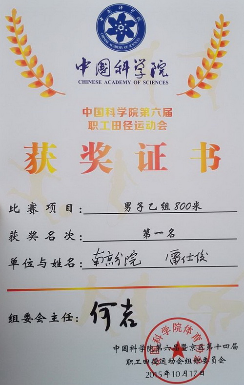 10月17日,中国科学院第六届职工田径运动会在北京举行,紫金山天文台雷仕俊同志代表南京分院代表队参加男子乙组800米跑步比赛,凭借高昂的士气和出色的竞技水平荣获冠军。