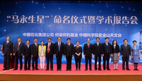 7月27日下午,在北京中国石化集团公司总部举行了“马永生星”命名仪式。中国科学院紫金山天文台(以下简称‘紫台’)发现的国际编号为210292号小行星,由何梁何利基金评选委员会推荐,经国际小行星命名委员会批准,以中国科学家马永生院士的名字命名为“马永生星”,党委书记张丽萍一行参加了命名仪式。出席命名仪式的有国家科技部原部长、何梁何利基金信托委员会主席、评选委员会主任朱丽兰,国务院国资委国有重点大型企业监事会原主席、何梁何利基金评选委员会秘书长段瑞春,中国石化集团公司董事长、党组书记王玉普,中国工程院副秘书长吴国凯,以及国家科学技术奖励工作办公室、中国工程院能源与矿业工程学部、中国科学院地学部、中国石油大学、中国地质大学相关领导和专家。