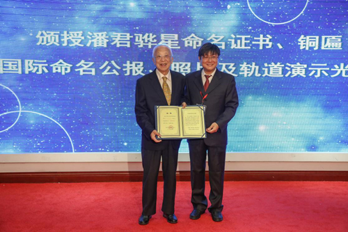 10月14日,由苏州大学、中国科学院紫金山天文台(简称紫台)、中国科学院国家天文台南京天文光学技术研究所(简称天光所)和中国科学院南京天文仪器有限公司(简称天仪公司)共同主办的“潘君骅星”命名仪式暨庆祝潘君骅院士从事科研工作67周年交流会在苏州成功举行。中国工程院院士姜会林、江苏省人民政府副秘书长王思源、国内光学技术研究所相关代表、苏州大学师生等出席了会议。紫金山天文台副台长吴雪峰、研究员赵海斌、杨捷兴、汪琦参加了仪式。仪式由苏州大学党委书记江涌主持。