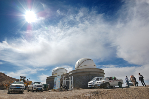 图6 与会专家学者考察冷湖赛什腾山海拔4200米选址点C,图中为已建成的西华师大50厘米双筒望远镜50BiN观测楼