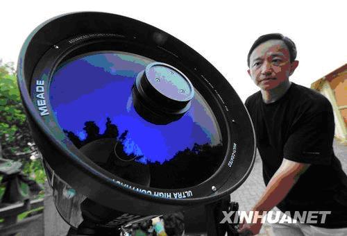 7月21日,紫金山天文台的天文工作者在苏州上方山观测点准备日食闪光谱仪。新华社记者孙参摄