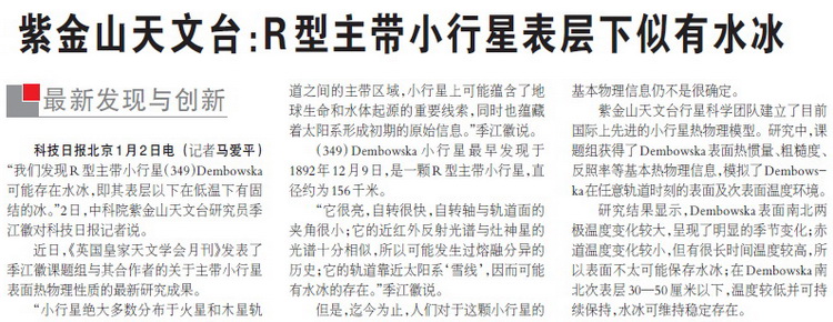 科技日报:紫金山天文台:R型主带小行星表层下似有水冰