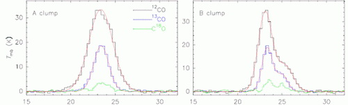(C) 云核A峰值处谱线。 (D) 云核B峰值处谱线。