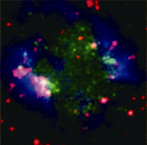 图1:星系Sextans A的多波段图像:蓝色部分代表的Very Large Array射电望远镜所探测到的氢原子质量分布,绿色是GALEX卫星所探测的来自大质量恒星的紫外发射,红色代表的是Herschel红外望远镜所探测到的来自尘埃。