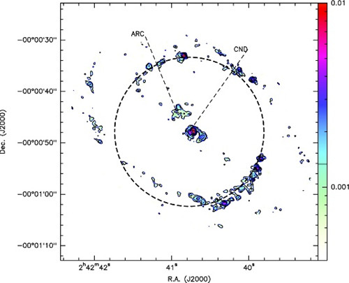 图2:ALMA 349 GHz尘埃连续谱发射图像,数据来自Santiago Garcia-Burillo