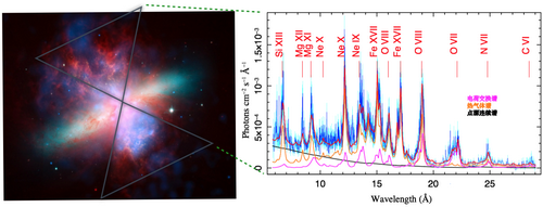 图1.左图为M82的三色假彩图,绿色为光学观测,显示星系本身,蓝色与红色分别为X射线观测与红外观测,表征星系尺度超级风中的热气体与冷气体(取自X-ray: NASA/CXC/JHU/D.Strickland; Optical: NASA/ESA/STScI/AURA/The Hubble Heritage Team; IR: NASA/JPL-Caltech/Univ. of AZ/C. Engelbracht)。右图为其双锥结构超级风的X射线辐射光谱,可用单温热谱、电荷交换辐射谱与幂律连续谱模型来完整拟合。