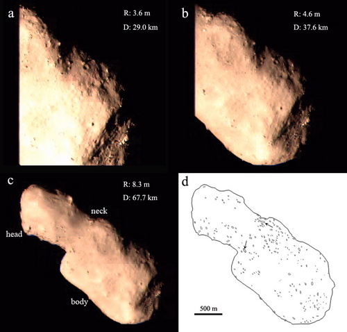 图1 图塔蒂斯小行星的光学图像(a-c)。R和D分别表示图像的分辨率和成像距离。d 为图塔蒂斯的素描轮廓图,显示了识别出的200多个碎石的表面分布位置。