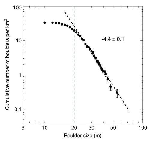 在该项工作中,研究人员利用嫦娥二号探测数据,在图塔蒂斯小行星表面共识别出200多个碎石,大小从10米到61米不等(图1)。对碎石的累积大小频率分布统计显示,它们呈现较陡的斜率(-4.4 ± 0.1)(图2),表明自形成以后遭受了较高程度的破碎过程,或来自后续撞击改造,或来自小行星表面昼夜温差变化引起的热疲劳(Thermal fatigue)。研究表明,大部分大于20米的碎石不是小行星表面撞击过程形成的溅射物,而是图塔蒂斯小行星母体形成时的残留碎片。这为其碎石堆(Rubble-pile)的结构成因提供了有力的证据。此外,撞击坑的累积大小频率分布图显示,图塔蒂斯表面的撞击坑保留年龄约为16亿年(图3)。与日本隼鸟号探测的丝川小行星(Itokawa)相比,同样作为近地小天体,图塔蒂斯和丝川小行星表面的碎石均相对均匀分布,而不是集中在撞击坑的周围。不同的是,图塔蒂斯表面的碎石分布斜率陡得多,可能与热疲劳过程有关。该项成果为研究小行星的形成演化和撞击历史提供了重要线索。