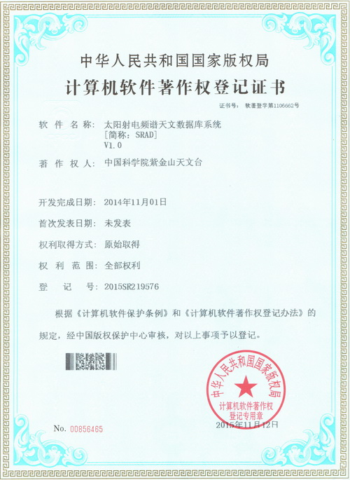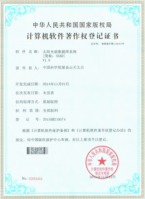 2015年11月12日,经国家版权局审核,紫金山天文台申请的《太阳光谱数据库系统[简称:SSAD]V1.0》、《太阳射电频谱天文数据库系统[简称:SRAD]V1.0》两项软件符合《计算机软件保护条例》和《计算机软件著作权登记办法》的相关规定,被认定为原始取得,并获得国家版权局颁发的《计算机软件著作权登记证书》(编号分别为:软著登字第1106660号和软著登字第1106662号)。