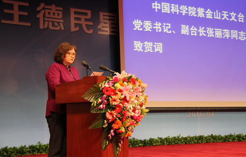 张丽萍代表紫台,向荣获小行星国际命名的王德民院士和大庆油田有限责任公司表示最热烈的祝贺。她说,王德民的名字进入了宇宙星空,镶上了太空星辰,将永载天文史册。“王德民星”体现了国际社会对王德民院士科技成就的褒扬,王德民院士荣获小行星国际命名是实至名归,我们通过“王德民星”的命名来表达对他的崇高敬意。