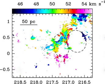 该区域分子云在视线方向上有三个速度成分:15km/s、27km/s和50km/s,分别位于银河系本地臂与英仙臂之间、英仙臂、外臂(图1)。其中27km/s成分云的主要包括一个处于超临界状态的纤维状结构S287-main。巡天工作首次发表的C18O(J=1-0)成图数据在S287-main中发现7个大质量C18O团块,分布在分子气体最大柱密度线上。对这些团块的质量-尺度关系研究表明,它们均很有可能形成大质量恒星(图2)。对50km/s成分获得首次可分辨分子谱线成图观测,揭示出其中3个正在膨胀的较大尺度的分子气体壳层结构(图3)。区域中年轻星分布在电离氢区S287附近和50km/s成分云中的壳层结构交界处呈现富集,表明这些年轻星的形成很有可能是电离氢区和壳层结构的膨胀所触发的。