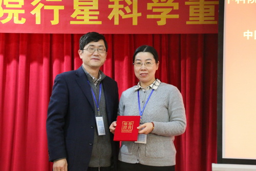 会上,举行了中科院行星科学重点实验室优秀青年奖颁奖仪式。为鼓励青年才俊勇攀科研高峰,中科院行星科学重点实验室自2014年起特设立了实验室优秀青年人才奖。来自紫金山天文台的王英博士因其在陨石学与天体化学方面的突出贡献,获得了2016年度该项奖励。实验室主任廖新浩研究员为获奖者颁发了证书。
