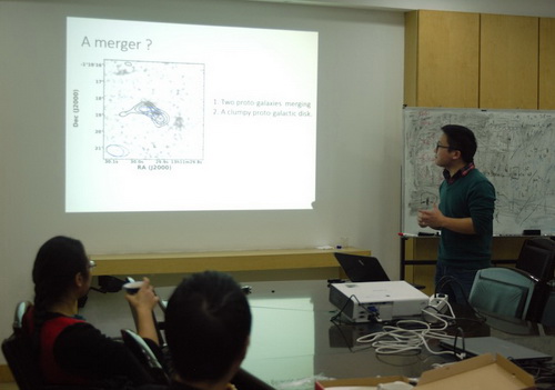 首先在新闻播报环节,覃建波同学为大学介绍了近来发现的含有大量星际尘埃的宇宙极早期(z=7.5)星系——A1689-zD1. 他首先汇报了一下这个星系的具体相关信息及发现的背景,包括距离质量大小及探测方法. 进一步介绍了在星系中尘埃的组成形成增长和瓦解, 去解释为何在宇宙极早期会有这么多尘埃, 是什么机制导致了星系在极短的时标内获得如此有效的金属增分. 在宇宙极早期由于气体充足,星系形成恒星速率极快,所形成的大质量恒星在演化后期通过星风或者超新星爆发将金属迅速返还到星际介质中,同时星际尘埃通过吸积气态金属而增长的效率也相对很高, 二者共同作用下便有可能在宇宙极早期便形成如此多的星际尘埃. 这一发现大大拓宽了我们对星系化学增分及星际尘埃增长的认识(Ref: Watson et al., 2015, Nature, 519:327). 本次Science News引发在场师生广泛兴趣与激烈讨论,包括报告人本人在内都受益良多.