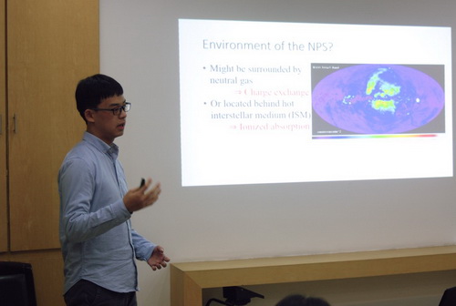 本次Journal Club的公众报告是由杨航同学为大家带来的“On the origin of the North Polar Spur: From the perspective of X-ray”,主要参考文献为Gu L. et al., 2016, A&A, 594, A78。本次报告主要介绍了关于银河系中的North Polar Spur (NPS)结构,以及从X射线观测对其起源的探究。NPS是存在于银河系中由银道面延伸至北银极区的一连续弧状射电结构,在X射线波段也能清楚地观测到此结构。关于NPS的起源一直存有争论,此前对X射线观测的数据分析曾认为其可能是一个超新星遗迹,或起源于OB星协的强烈星风。报告介绍,文章的作者重新回顾了此前的X射线数据分析,认为其中存在着仅用碰撞电离平衡等离子体加中性气体吸收所不能解释的谱线特征。在引入不同的拟合模型后,作者对比了它们的拟合光谱细节,认为在原有组分中再加入一个高电离度吸收气体成分能够有效重现观测到的谱线特征,足以认为这是一个更接近真实物理过程的模型。由此得到的模型参数与之前有较大变化,同时可推测NPS应是位于银晕内的一个结构,与地球之间的距离为6-7 kpc。报告结束后大家就报告内容讨论了NPS以及其它银河系内弥漫X射线辐射的起源和进行此类研究的科学意义,并就此引出的开放科学问题各抒己见,形成了热烈的讨论氛围。
