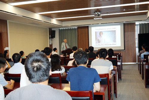 纪念演讲中,鲁国镛先生的遗孀Helen Lo女士首先讲话,回顾了鲁先生令人印象深刻的往事,表示了对先生的怀念。鲁国镛先生的生前同事兼好友James Moran教授作了“The 2nd Fred Lo Lecture”专题报告,介绍了由鲁国镛先生开创和推动的一系列重大天文科学研究的进展,包括河外超脉泽NGC4258的发现、黑洞吸积盘的超高分辨测量以及河外超脉泽测量哈勃常数,追忆往昔,深表对鲁国镛先生的怀念。纪念演讲之后,Moran教授一行参观了毫米波和亚毫米波技术实验室,与紫台科学家进行了学术交流。