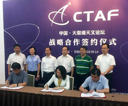 9月14日下午,中国天泉湖天文论坛战略合作协议签约仪式在中国科学院紫金山天文台盱眙观测站举行。淮安市副市长顾坤,盱眙县委书记梁三元、县委副书记、县长朱海波,中国科学院国家天文台原台长严俊、党委副书记石硕,紫金山天文台副台长毛瑞青等出席签约仪式。