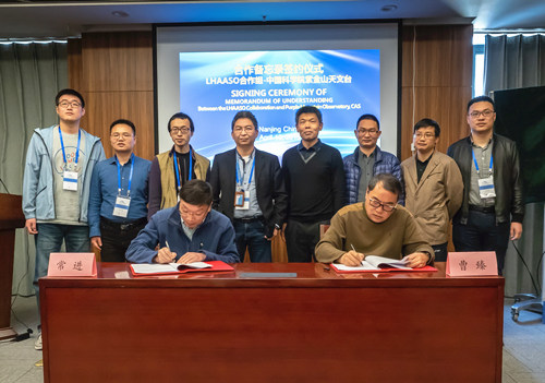2019年4月15日,“高海拔宇宙线观测站”(Large High Altitude Air Shower Observatory; LHAASO)项目首席科学家、工程经理,中国科学院高能物理研究所曹臻研究员和中国科学院紫金山天文台副台长常进研究员在紫台仙林园区签署合作备忘录,标志着紫台的科研团队正式加入LHAASO国际合作组。