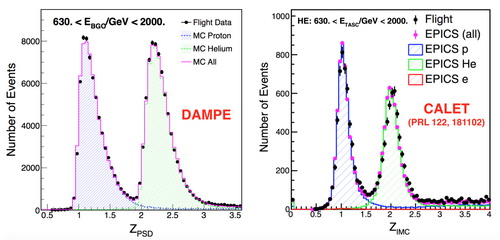 图 1 “悟空”号电荷谱(左)和CALET探测器电荷谱(右)