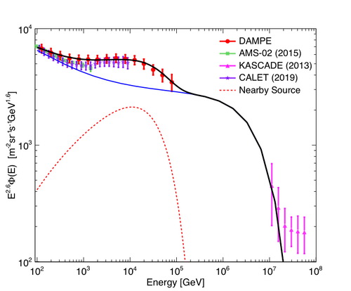 “悟空”号的测量结果确认了质子能谱在数百GeV处的变硬行为。更为重要的是,“悟空”号首次发现质子能谱在约14 TeV出现明显的能谱变软结构,这一新的结构很可能是由近邻个别宇宙线源留下的印记,拐折能量即对应于其加速上限(图3)。“悟空”号的结果对揭示高能宇宙线的起源以及加速机制具有十分重要的意义。