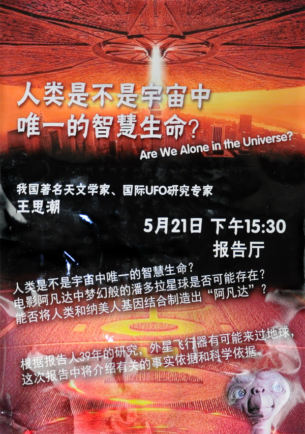 王思潮研究员首先从电影《阿凡达》里的潘多拉星球开始,讲述了人类探索地外文明的历程以及研究UFO现象对我们的重要意义。报告会图文并茂,语言生动活泼,现场气氛非常活跃,师生们纷纷表示通过报告会他们受益匪浅,既开阔了眼界,也加深了对浩瀚宇宙的认识。报告会后,王思潮研究员还与同学们进行了交流互动,精彩的问答不时赢得了阵阵掌声,将科普讲座的气氛推向了高潮。