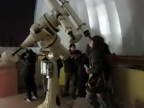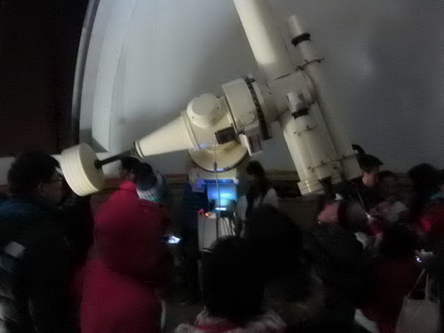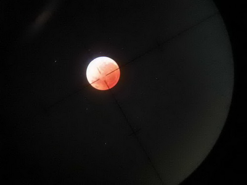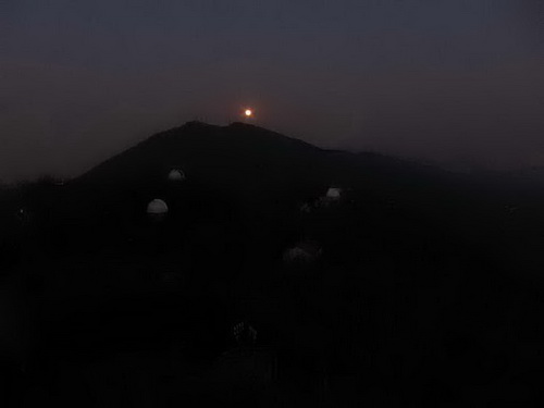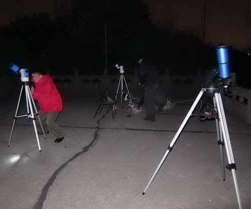 活动当天,从晚上七点开始,数十位天文爱好者及媒体人士陆续来到紫金山天文台的紫金山园区参加观月活动。紫台科普部为大家安排了大台和天堡城两处赏月地点,除了直接目视观赏外,还在科普部工作人员及紫台研究生的指导下,让大家通过天堡城的折轴望远镜和大台平台上的几架小型科普望远镜观看月全食时的细节。现场气氛热烈,交流活跃。当全食来临时,在东部天区,一轮红月高挂头顶,猎户、双子、昴星团、天狼星等纷纷现身,众星捧月,拱卫左右,明亮的木星则独守西天,遥相呼应。这一震撼人心的景致持续了52分钟,令人大饱眼福。大家还通过望远镜仔细观看了偏食时的明暗分界线、全食时亮度不均匀的月面等细节。通过活动,大家了解了月全食的原理,亲眼目睹了完整过程,更加激发了对天文的兴趣。