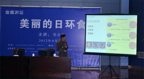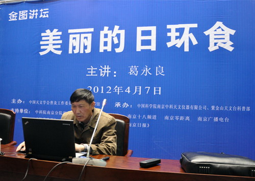 4月7日上午,由中国天文学会普及工作委员会主办的2012年天文科普系列活动的开篇之作在金陵图书馆举行。紫金山天文台副研究员葛永良为南京市民作了题为“美丽的日环食”精彩科普报告。