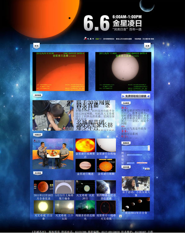 根据中科院紫金山天文台的历算预报,本世纪最后一次金星凌日在北京时间2012年6月6日上午发生。紫金山天文台在本次金星凌日期间开展了视频直播活动,让广大公众通过网络目睹了这一难得的特殊天象,继上个月日环食之后再一次掀起公众关注天文的热潮。