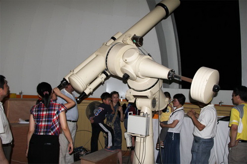 随后,大家进入天文圆顶,通过望远镜观看月球和土星及其卫星,工作人员在一旁不时地向大家讲解相关知识。月球上的环形山和美丽的土星光环,引发了大家的阵阵惊叹。许多人还拿起相机对着目镜拍下天体的照片,虽然效果有限,却留下一幅幅自己亲手摄制的作品。