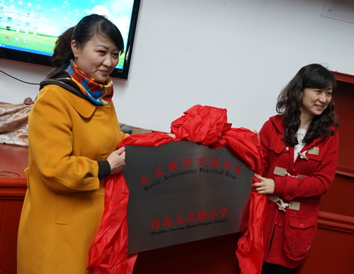 上午10:00,挂牌仪式正式开始,青岛观象台孙台长与大名路小学周校长一同为“青岛大名路小学天文课程实践基地”揭牌。大名路小学也是继青岛天文特色学校宁安路小学之后,又一所将天文教育纳入实践课程之中的学校。天文课程实践基地挂牌之后,青岛观象台除了在大名路小学开展天文课程之外,也将一同合作开展各种天文活动。相信在我们的共同努力下,大名路小学的天文教育将会取得长足的进步。