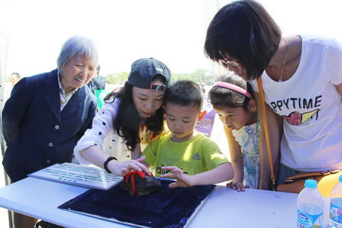 参加南京市科普周主会场活动,小朋友触摸天外来客—陨石