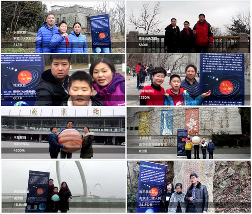 而此次等比例太阳系模型体验活动,则从星球尺寸和空间距离两个层面上模拟太阳系。元旦活动当天,八大行星模型被放置在天堡城观测台圆顶前,太阳和八大行星的尺寸比例让人一目了然。而在此之前的一周里,赤壁路小学已经挑选8个家庭扮演八大行星,带着行星模型分别到紫台光谱房、紫金山天文路、明孝陵、中山植物园、南京眼等8个指定地点进行了自拍与航拍,模拟各个行星与太阳之间的距离。